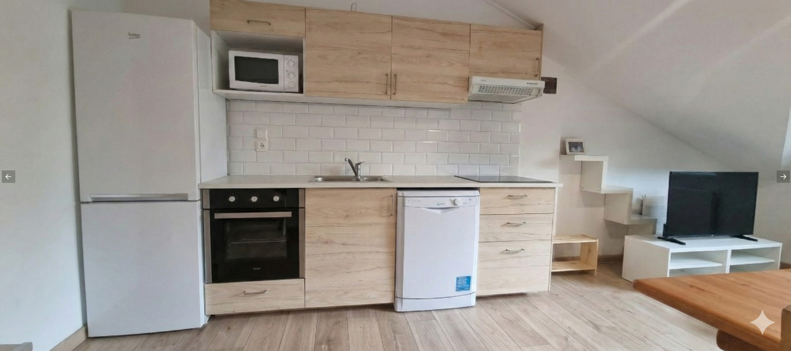La cuina americana, de vitroceràmica, està equipada amb nevera, microones, forn, congelador i rentaplats.